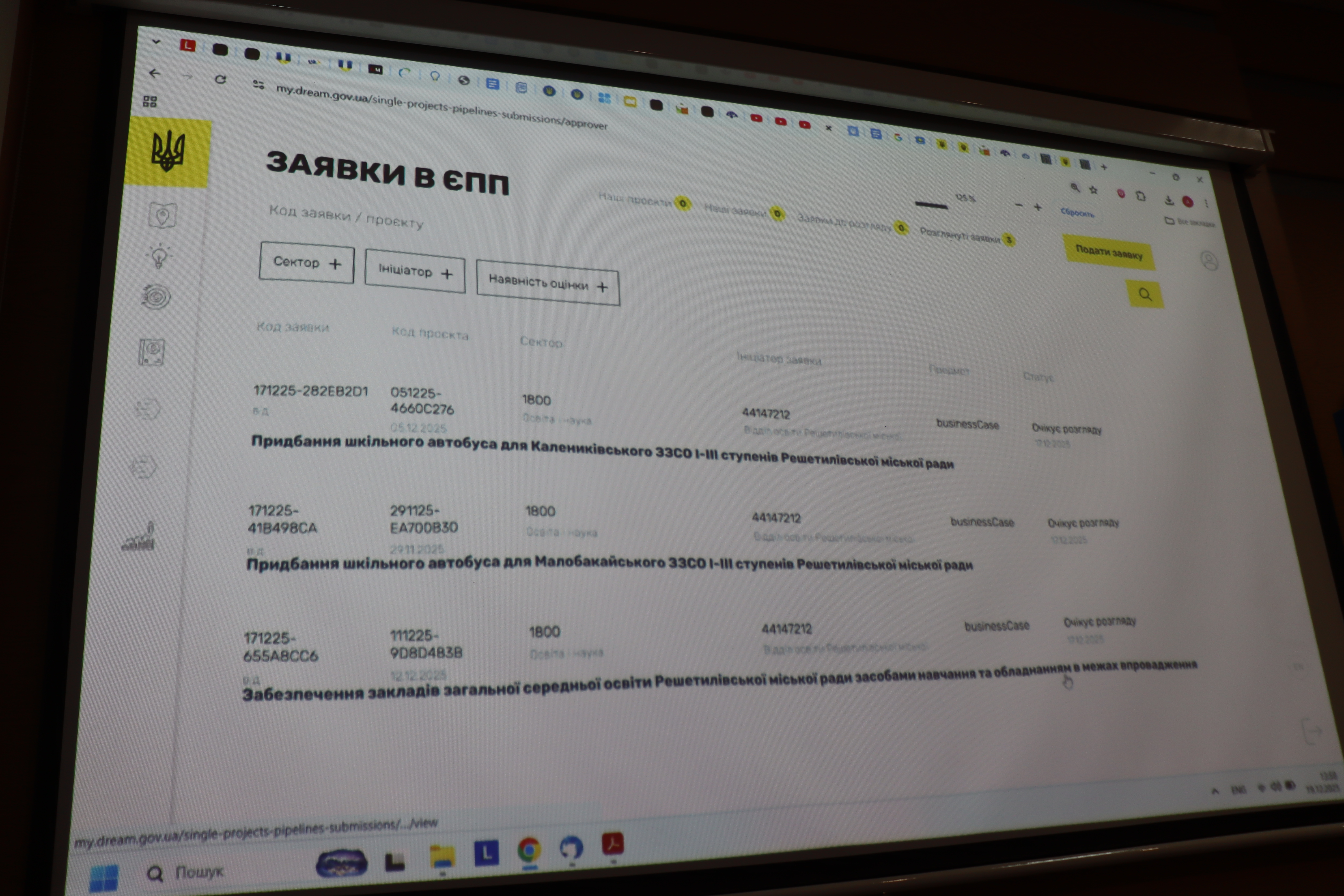 Так, відповідно до затверджено середньострокового плану пріоритетних публічних інвестицій Решетилівської міської територіальної громади на 2026-2028 роки, відділом освіти Решетилівської міської ради через систему DREAM на відбір до ЄПП було подано три проєкти: