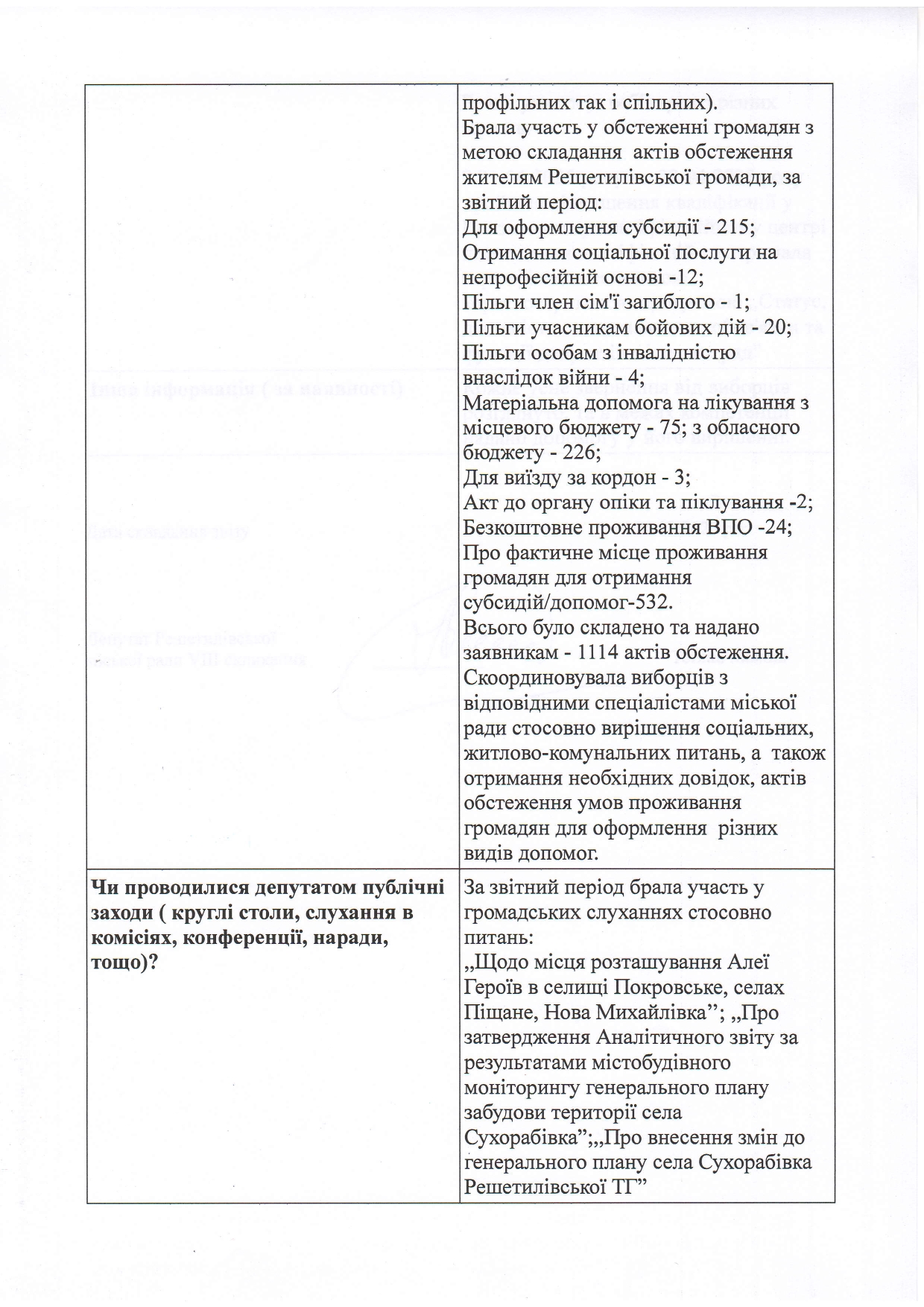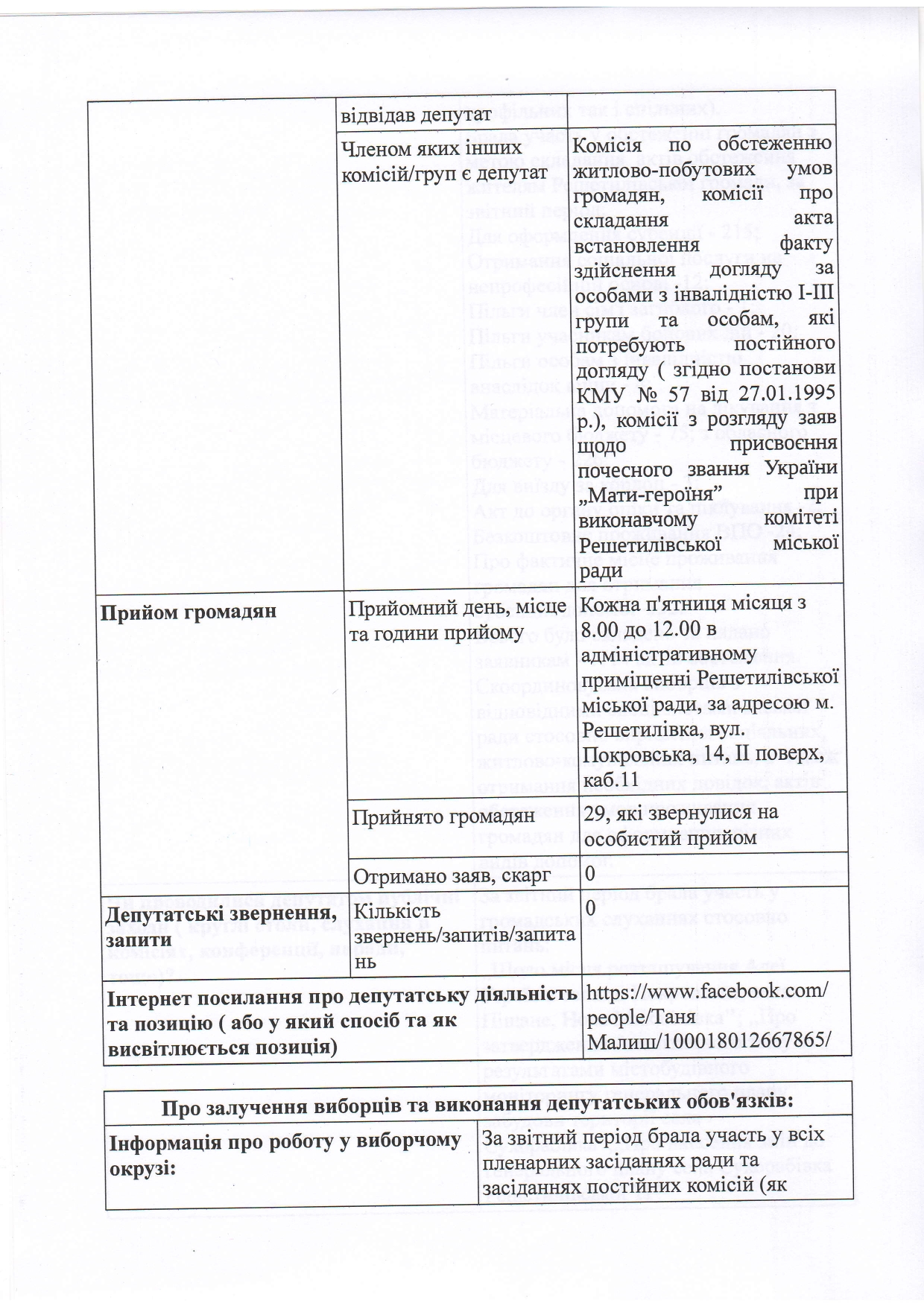 Звіт депутата Решетилівської міської ради VIII скликання за 2021 рік Малиш Тетяни Анатоліївни