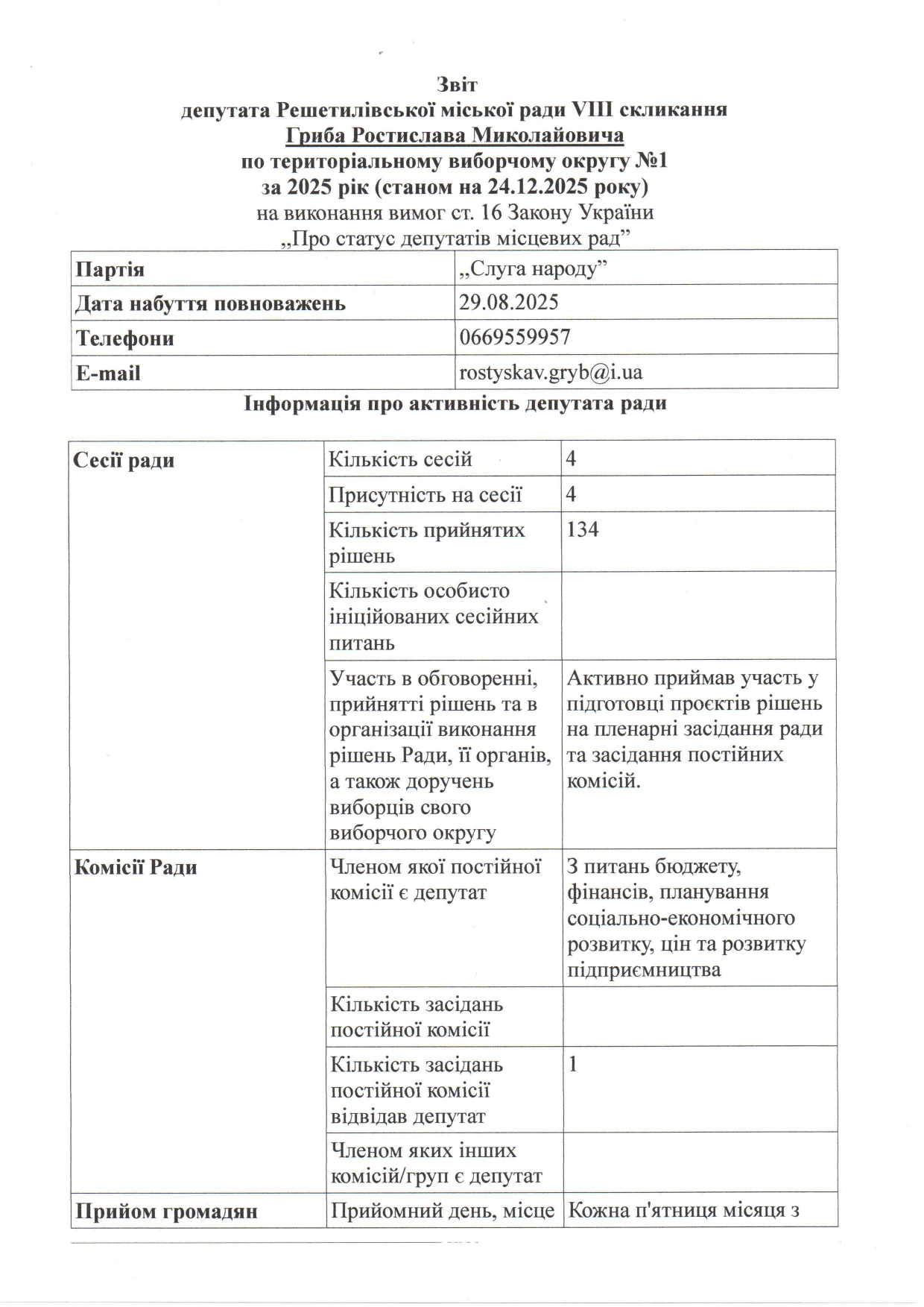 Звіт депутата Решетилівської міської ради VIII скликання за 2025 рік Гриба Ростислава Миколайовича