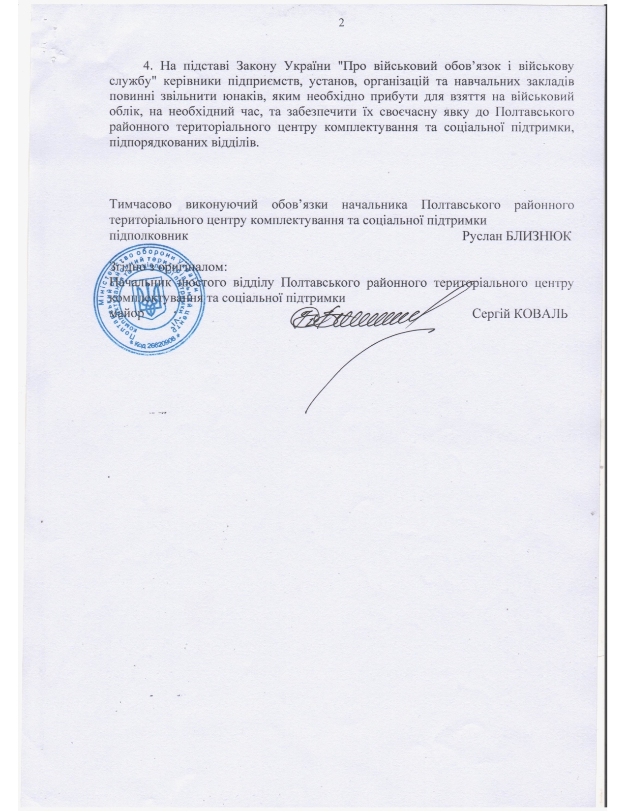 Витяг з наказу начальника Полтавського РТЦК та СП про взяття на військовий облік громадян 2009 року народження до Полтавського районного територіального центру комплектування та соціальної підтримки та підпорядкованих віддлах у 2026 році.