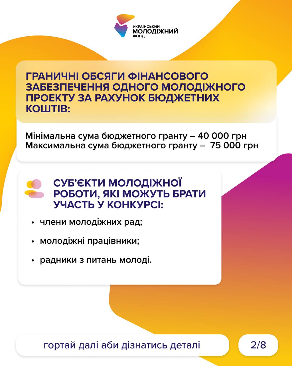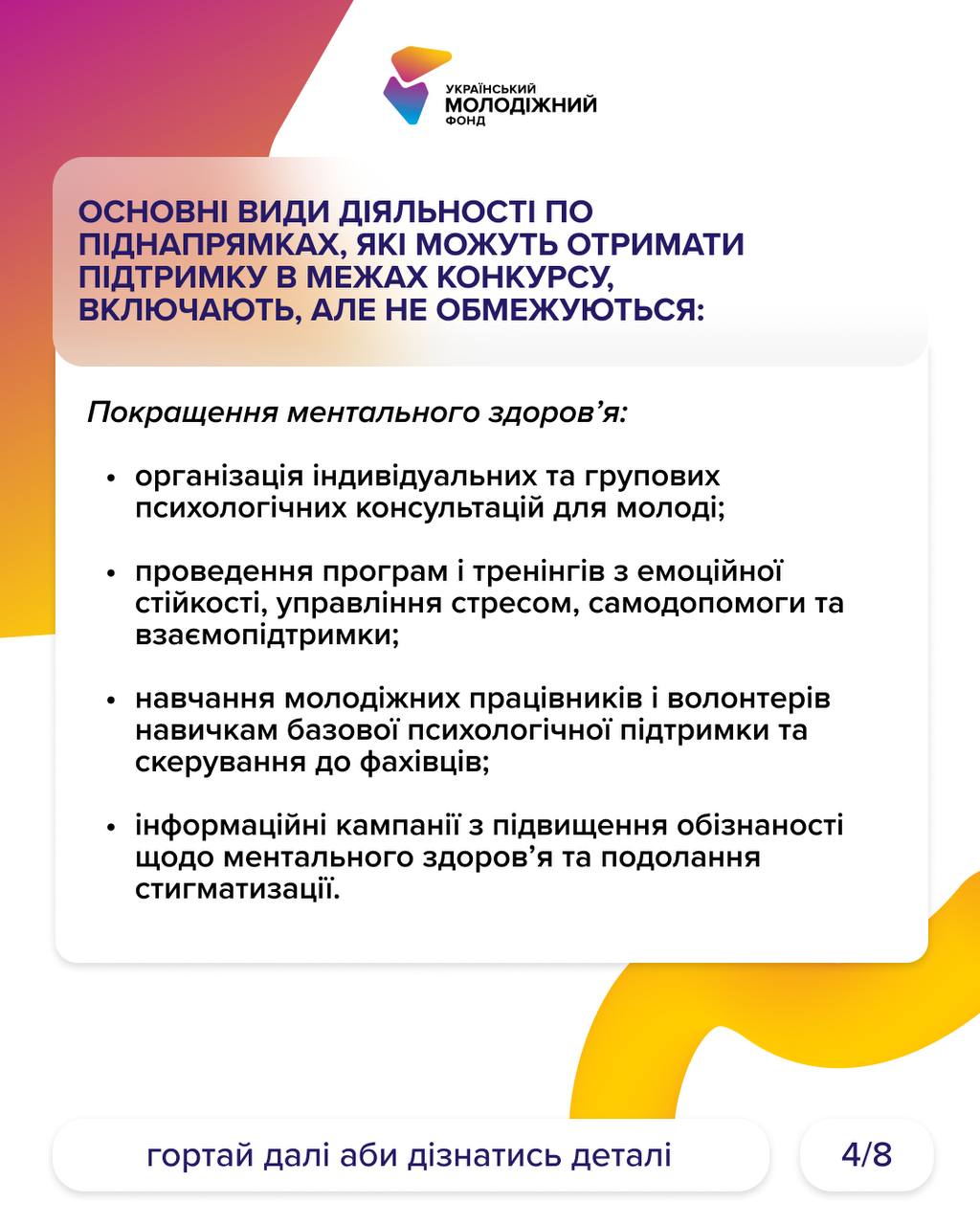 Конкурс за пріоритетним напрямом «Розвиток стійкості, безпечного середовища та психоемоційного благополуччя молоді» для фізичних осіб реалізується Міністерством молоді та спорту України і Українським молодіжним фондом.