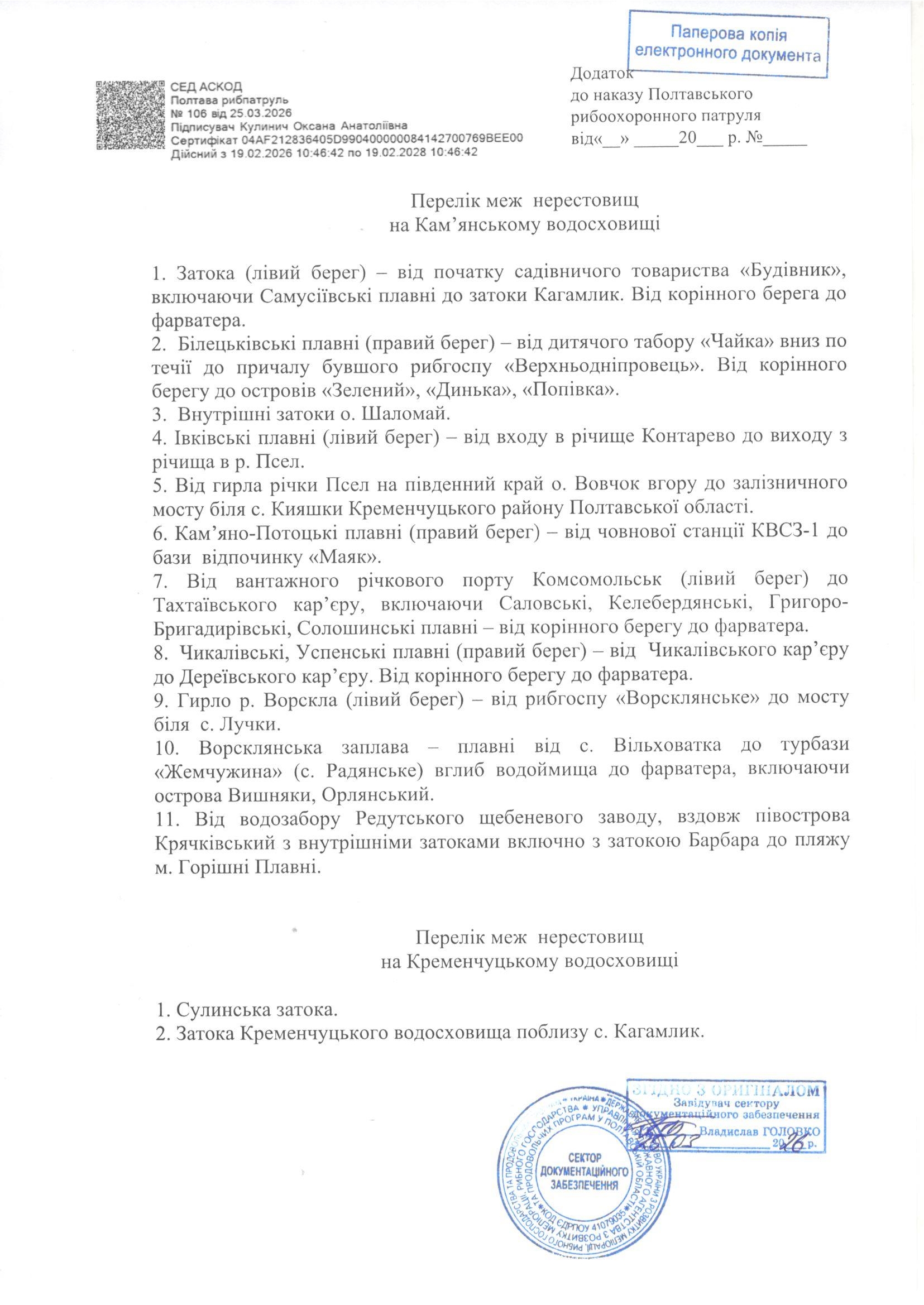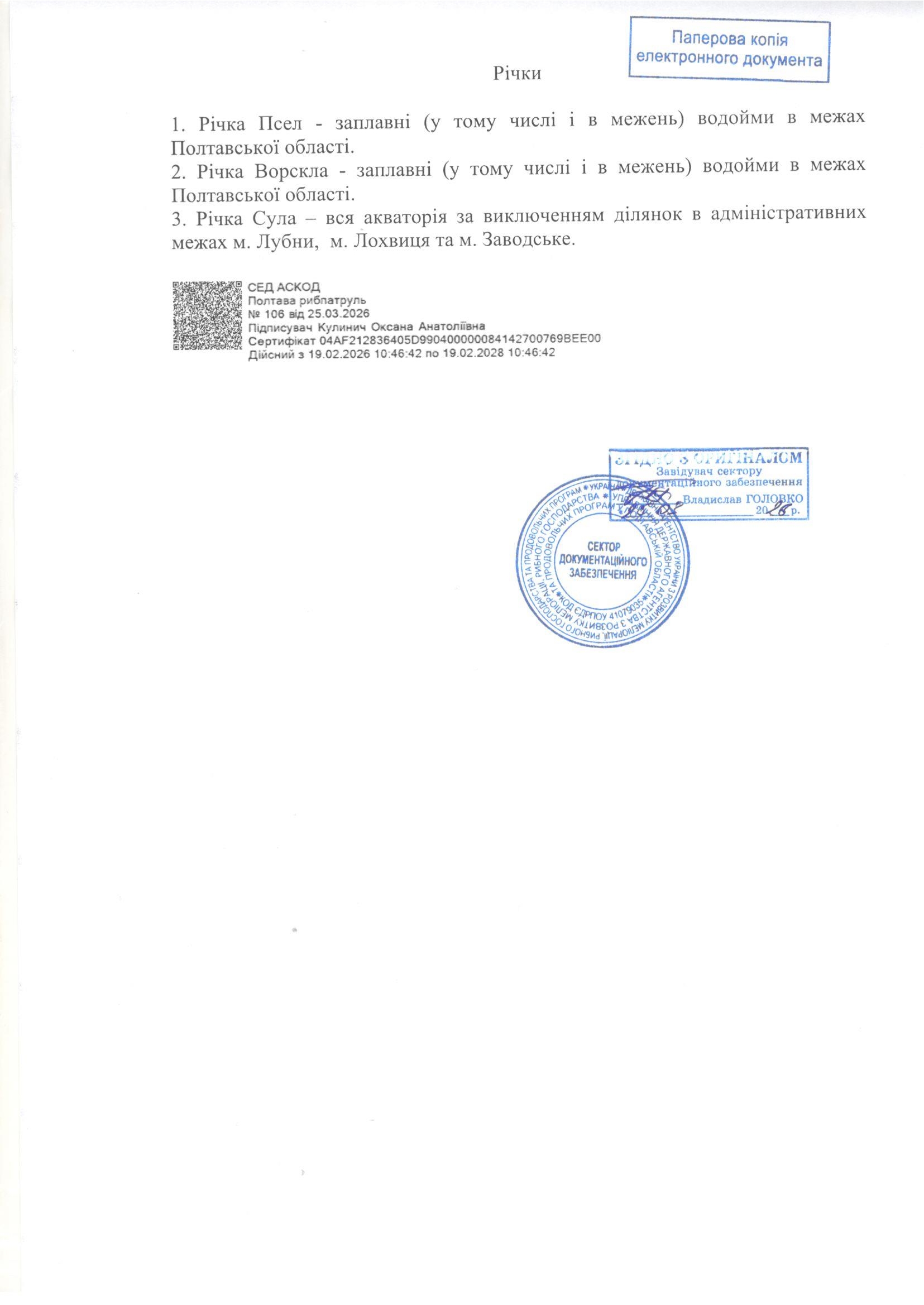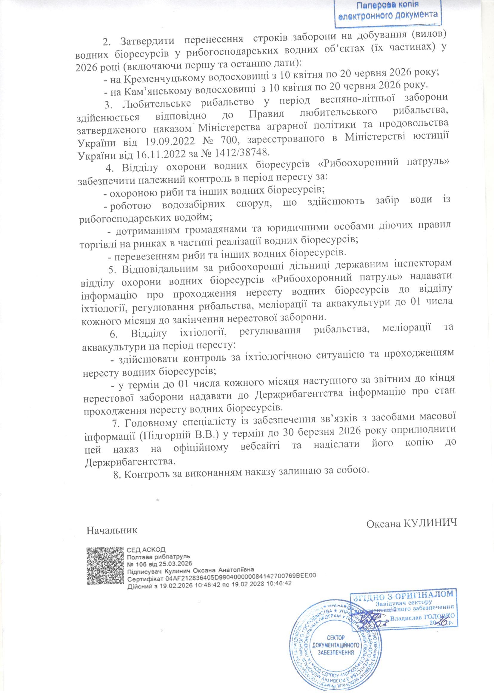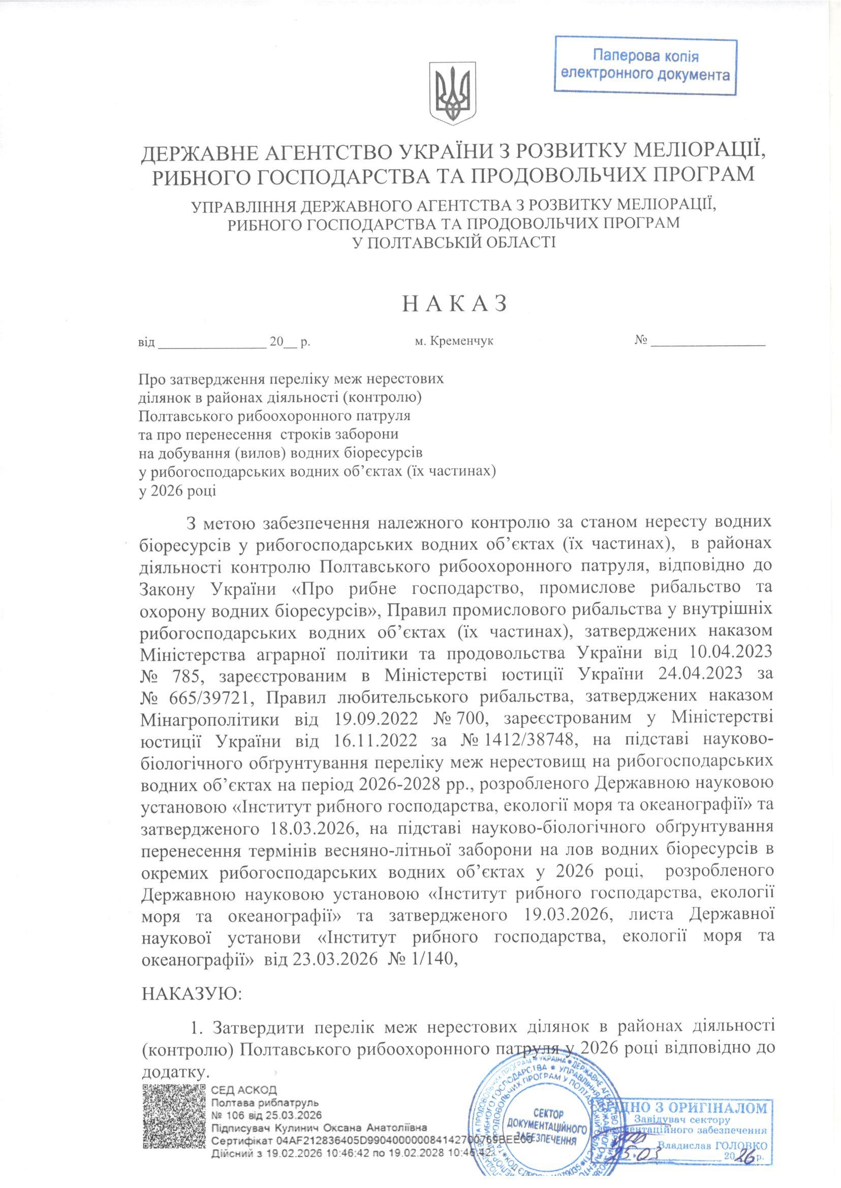 Наказ Управління Державного агентства з розвитку меліорації, рибного господарства та продовольчих програм у Полтавській області від 25.03.2026 за №106 "Про затвердження переліку меж нерестових ділянок в районах діяльності (контролю) Полтавського рибоохоронного патруля та про перенесення строків заборони на добування (вилов) водних біоресурсів у рибогосподарських водних об'єктах (їх частинах) у 2026 році"